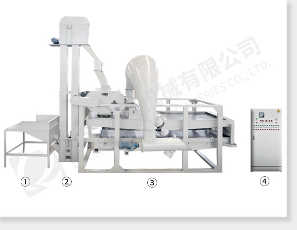 ① 上料斗② 斗式提升機(jī) ③ 脫殼、風(fēng)選、分選主機(jī) ④ 電氣控制柜