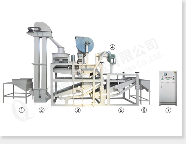 ①приёмный бункер ②ковшовый элеватор③главная машина (шелушитель, вибросито для удаления шелухи и вибросито для сепарации нелущённой семечки и крупы)④пневматическое подъёмное устройство ⑤машина для повторной сепарации нелущённой семечки и крупы⑥бункер для сбора крупы ⑦электрический управляющий шкаф